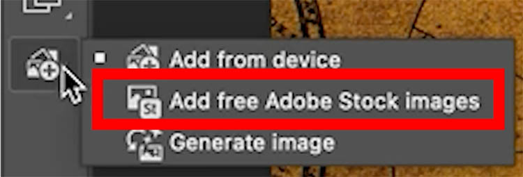 With the move tool active (v key) look to the Contextual Task bar and click Add free stock images. (If you don’t see it open the task bar Window>Contextual Task Bar, if you don’t see the button, use the other methods I show in this tutorial)