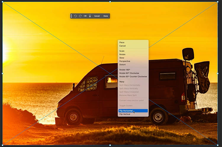 Let’s flip it around. Press Cterl/Cmd+T if you don’t see the bounding box. Right-Click and choose Flip Horizontal. (You could also use the icon in the task bar).
