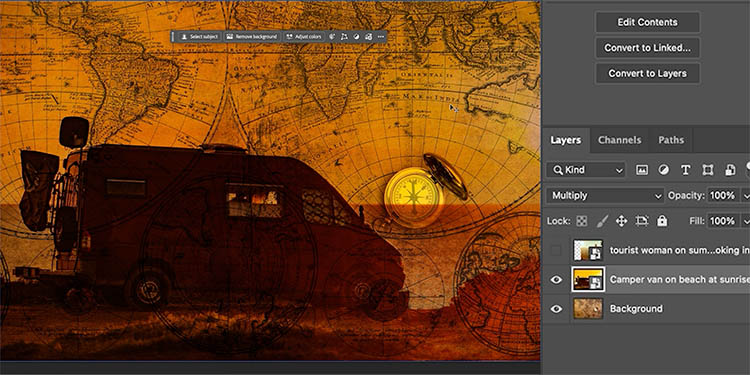 Choose the Van layer and change the layer blending mode from Normal to Multiply. See how nicely everything blends together.