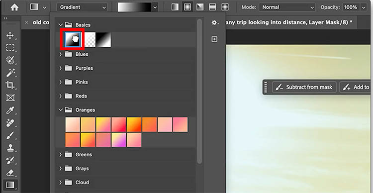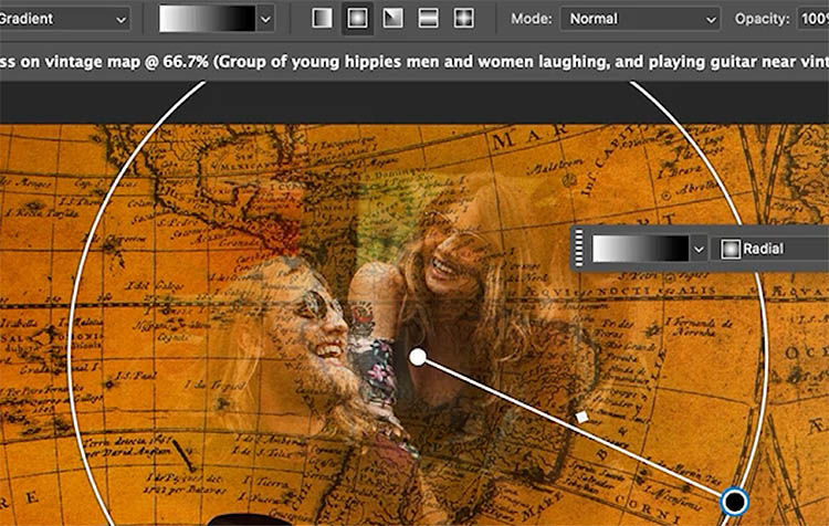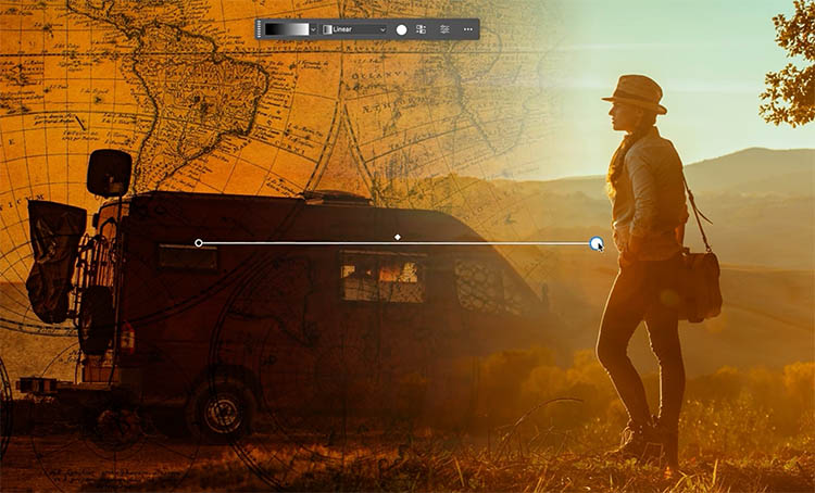 Drag the gradient across the image to blend the 2 layers together. Watch the video at top for more options.