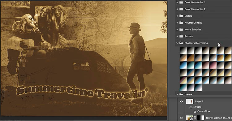In the properties panel, Under the gradients, choose some from the photographic toning set. See how amazing they look?
